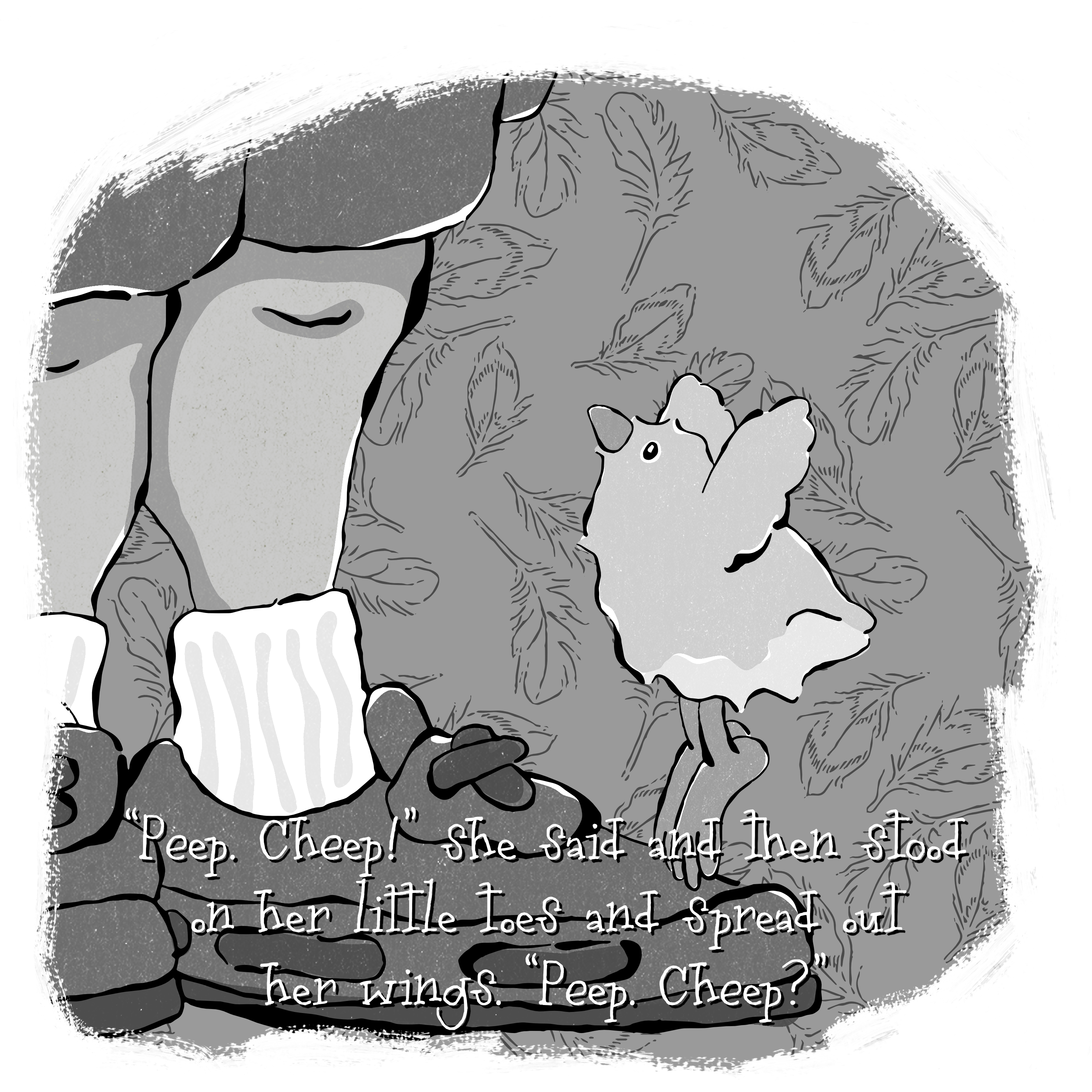 It is doubtful that my work will every be as good as the classic illustrators I admire so much, but hopefully this little illustration will capture your imagination and cause you to wonder what “Peep. Cheep?” might mean. Of course, if you are a regular reader, you have probably already guessed from the pose and the innocently hopeful expression.
