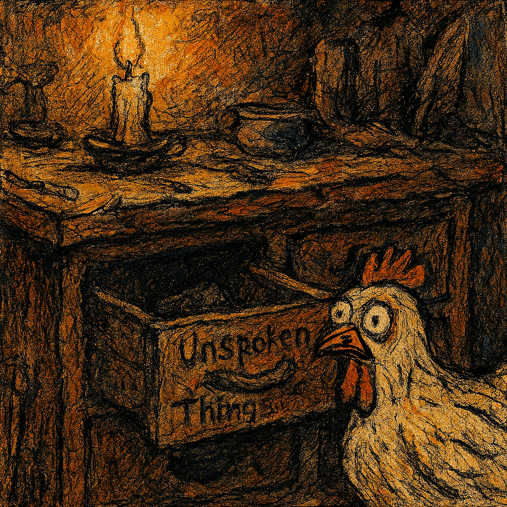 The drawing above does have a startled Halloween stare suitable for a collection of Halloween stories! And that got us thinking…what would genuinely be scary and startling for chickens and children?!? Without being comical (Pearl’s choice) or grossly gory (John’s choice).